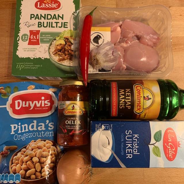Boil the rice following the instructions on the packaging. Chop the onion and garlic and cut the chicken into strips. Heat the oil in a wok. Stir-fry the chicken and the onion for 3 minutes. Add the garlic, sambal, sugar and soy sauce to the chicken and stir-fry 3 minutes more. Halve the red pepper lengthwise and remove the seeds with a sharp knife. Cut the pepper into rings. Serve the chicken soy sauce with the rice. Sprinkle the red pepper and the peanuts over the dish.