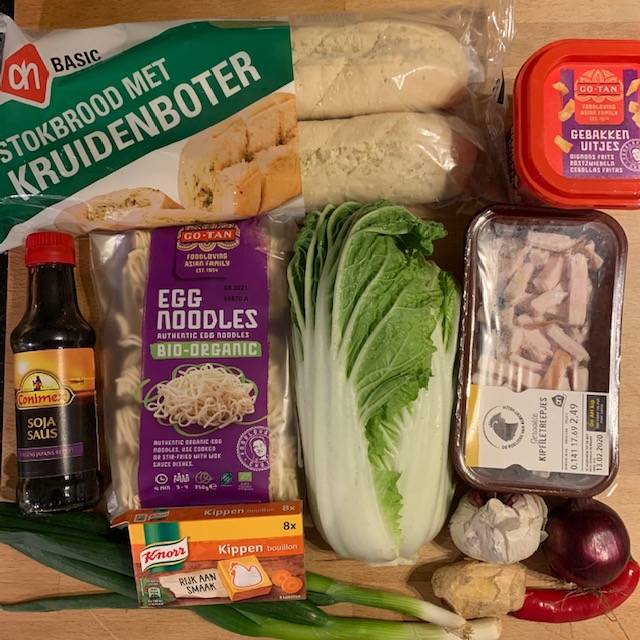 It is a waste to throw away vegetables. During the preparation of babi ketjap a half Chinese cabbage, a half red pepper and some ginger leftover. These ingredients could be used well with this soup. I made a few small changes to the @allerhande dish (Dutch food magazine), such as adding a baguette, to make it a real meal.