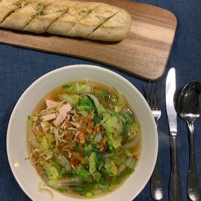 Het is zonde om groenten weg te gooien. Bij de bereiding van babi ketjap bleef er nog een halve Chinese kool, halve rode peper en wat gember over. Deze ingrediënten konden goed gebruikt worden bij deze soep. Bij het gerecht van @allerhande heb ik een paar kleine aanpassingen gedaan, zoals toevoeging van stokbrood, om er een echte maaltijd van te maken.