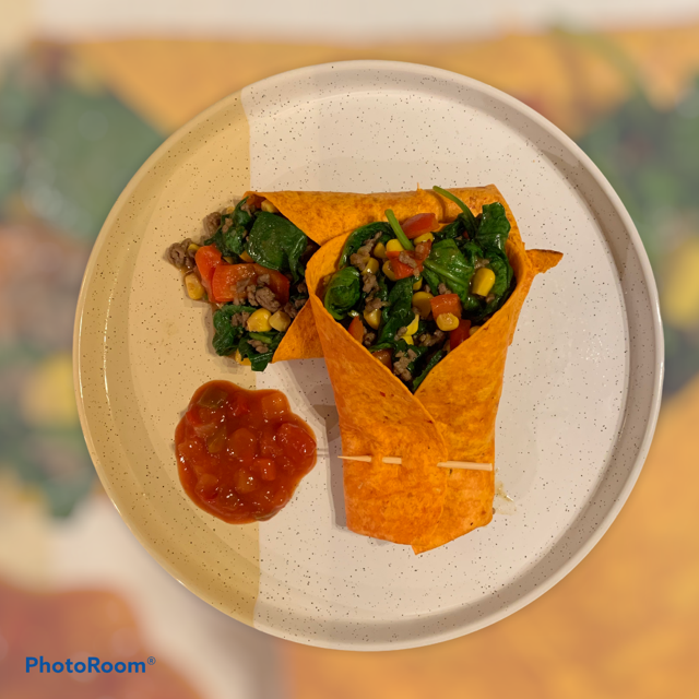 Paprika schoonmaken en in stukjes snijden. In braadpan olie verhitten en rundergehakt in 3 minuten rul bakken. Paprika toevoegen en 3 minuten meebakken. Mix en 125 ml water toevoegen. Aan de kook brengen en 10 minuten op laag vuur laten indikken. Maïs laten uitlekken en toevoegen. Spinazie erbij doen en al omscheppend 2 minuten op hoog vuur meebakken. In koekenpan de tortilla’s 30 seconde per zijde verwarmen, met gehaktmengsel vullen en dichtvouwen als een envelop. Tortilla's met saus serveren.