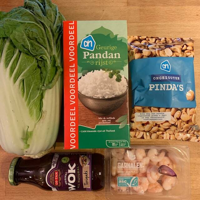 Mix the shrimps in a bowl with half of the teriyaki wok sauce. Let them stand marinate for 10 minutes. Cook the rice according to the instructions on the package and let it evaporate. Meanwhile, thread the shrimp onto the skewers. Cut the Chinese cabbage into strips. And finely chop the garlic. Roughly chop the peanuts. Heat the oil in a wok, add the garlic and cabbage and stir fry over medium heat for 4 minutes. Season with salt and pepper. Heat a skillet and cook the skewers over medium heat for 2 minutes. Turn halfway through and add the rest of the sauce. Spoon the rice on 2 plates or in bowls. Add the skewers and cabbage. Sprinkle the cabbage with the peanuts.