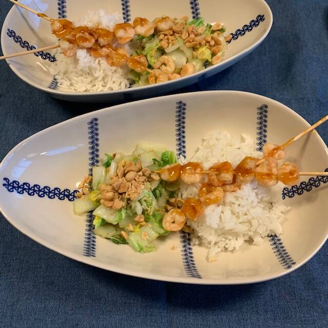 Meng de garnalen in een kom met de helft van de teriyaki woksaus. En laat ze 10 minuten marineren. Kook de rijst volgens de aanwijzingen op de verpakking en laat deze uitdampen. Rijg ondertussen de garnalen aan de satéprikkers. Snijd de Chinese kool in reepjes. En snijd de knoflook fijn. Hak de pinda’s grof. Verhit de olie in een wok, voeg de knoflook en kool toe en roerbak 4 minuten op middelhoog vuur. Breng op smaak met peper en zout. Verhit een koekenpan en bak de spiesjes 2 minuten op middelhoog vuur. Keer halverwege en voeg de rest van de saus toe. Schep de rijst op 2 borden of in schalen. Leg de spiesjes en kool erbij. Bestrooi de kool met de pinda's.