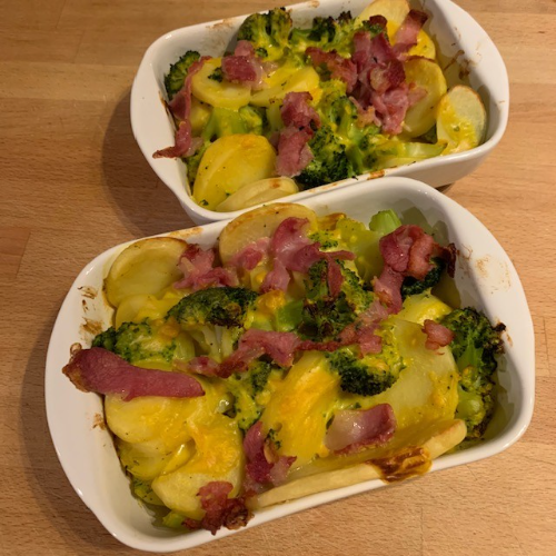 Preheat the oven to 190 °C. Cut the bacon into stripes. Divide the broccoli into florets and cut the stem into slices. Cook the broccoli for 6 minutes and drain the cooking liquid. Meanwhile, prepare the curry sauce with the milk according to the instructions on the package. Mix broccoli, potato slices and half of the curry sauce in a greased oven dish and season with pepper. Pour over the rest of the sauce and sprinkle with bacon. Bake the potato-broccoli dish in the oven for 25-30 minutes until golden brown and done.
