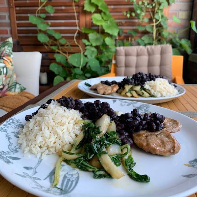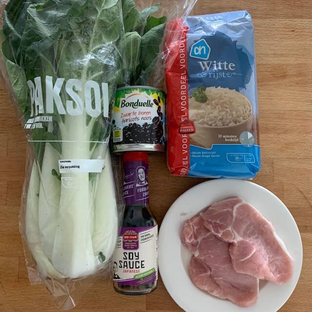 Kook de rijst volgens de aanwijzingen op de verpakking. Snijd de stelen en het blad van de paksoi in reepjes. Dep het vlees droog met keukenpapier en bestrijk met 1 eetlepel sojasaus. Doe de bonen met het vocht in een steelpan en verwarm op laag vuur 10 minuten. Verhit ondertussen 1 eetlepel olie in een wok en bak de filetlapjes 3 minuten. Keer halverwege. Neem uit de pan en houdt het warm in aluminiumfolie. Voeg in deze pan 1 eetlepel olie toe roerbak de paksoi 2 minuten hierin. Breng op smaak met de rest van de sojasaus. Verdeel de rijst, paksoi en het vlees over 2 borden. Laat de bonen uitlekken in een zeef en schep op over het gerecht.