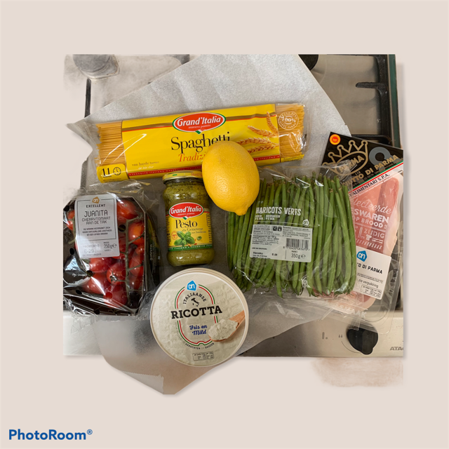 Preheat the oven to 200°C. Spread the cherry tomatoes and Parma ham on a baking tray lined with baking paper. Drizzle the cherry tomatoes with the oil and bake in the middle of the oven for about 10 minutes. Meanwhile, cook the spaghetti according to the instructions on the package. Remove the stem from the haricots verts, halve them and cook with the pasta for the last 4 minutes. Squeeze ½ of the lemon and cut the rest into wedges. Mix the ricotta with the pesto and lemon juice. Season with pepper and possibly salt. Drain the pasta and haricots verts and reserve a cup of the cooking liquid. Mix the pasta with the ricotta-pesto sauce, haricots verts and possibly some cooking liquid. Divide the cherry tomatoes on top and break the Parma ham over it. Serve with the lemon wedges.