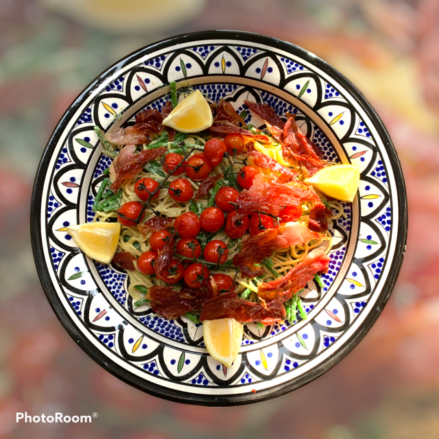 SPAGHETTI WITH RICOTTA PESTOSAUS & CRISPY HAM