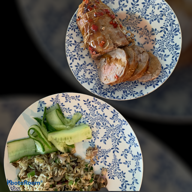 Verwarm de oven voor op 180 °C. Verwijder het steeltje en de zaadlijsten van de rode peper. Snijd het vruchtvlees fijn. Meng de rode peper met 4 el woksaus en bestrijk de rollade ermee. Vet de ovenschaal. Leg de rollade in de ovenschaal en bak in ca. 45 min. in het midden van de oven gaar. Kook ondertussen de rijst volgens omschrijving verpakking en laat dit afkoelen. Rasp de groene schil van de limoen en pers de vrucht uit. Meng dit samen met 1 el olijfolie extra vierge in een schaal. Schaaf met een kaasschaaf de ongeschilde komkommer in plakjes.. Breng op smaak met peper en eventueel zout. Verhit de olie in een wok en roerbak de roerbakmix 3 min. Voeg de rijst toe en roerbak 3 min. Breng op smaak met de sojasaus en peper. Neem de rollade uit de oven, verwijder het netje en snijd in plakken. Sprenkel de rest van de woksaus erover. Serveer met de rijst en komkommersalade.
