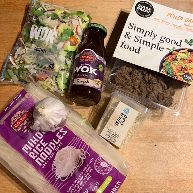 Bereid de noedels voor volgens aanwijzing op de verpakking. Verhit ondertussen in een koekenpan 1 eetlepel olie en wok de roerbakgroenten en knoflook voor 3 minuten op middelhoog vuur. Voeg de pulled oats en teriyaki woksaus toe aan wokgroenten en roerbak 2 minuten mee. Voeg de gewelde noedels al toe. Bestrooi met sesamzaad. Serveer direct.