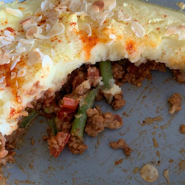 It’s not easy to see on the picture what’s under the roof of puree, but the mix of the loose pieces, green beans, tomatoes and mustard is really great. I really don't taste the difference with minced meat.
