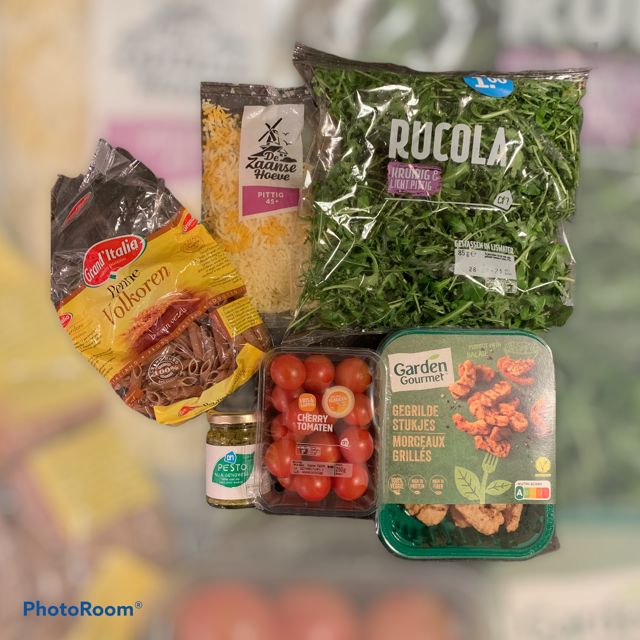 Cook the pasta al dente according to the instructions on the package. Drain and collect 50 ml of cooking liquid (per 2 persons). Meanwhile, heat the grilled pieces in the airfryer for 6 minutes at 160 ° C (not preheated, or otherwise according to the packaging description). Halve the tomatoes and roughly chop the arugula. Mix the pesto, grilled pieces, cheese and the cooking liquid through the pasta. Add the tomato and arugula and season with salt and pepper.