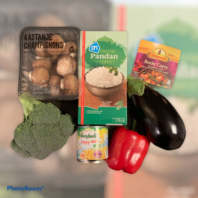 Cut the eggplant into cubes. Cut the bell pepper into small strips and halve the mushrooms. Cut the broccoli into florets and cook the broccoli for 5 minutes in a base of water with salt until al dente. Drain and set aside. Cook the rice according to the instructions on the package. Heat the oil in a large pan and fry the curry paste for 2 minutes. Add the mushrooms, corn, bell pepper and eggplant to the curry paste in the pan. Stew the vegetable curry for 15 minutes with the lid on the pan and over low heat. Now add the broccoli and fry for another 3 minutes on high heat. Season the vegetable curry with salt and pepper if necessary. Serve with the rice.